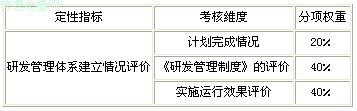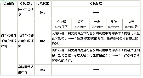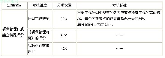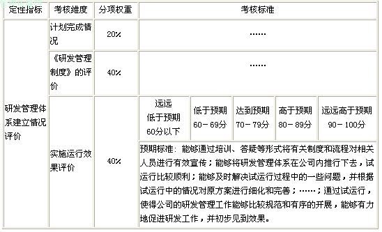例如:某公司的研发部经理某个考核期内的一项重要工作就是建立公司的研发管理体系。那么对这项工作的考核很显然只能是定性考核。运用上面的方法,经过考核双方的讨论,决定从3个最重要的方面来考察这个定性指标的完成情况,如下表所示: