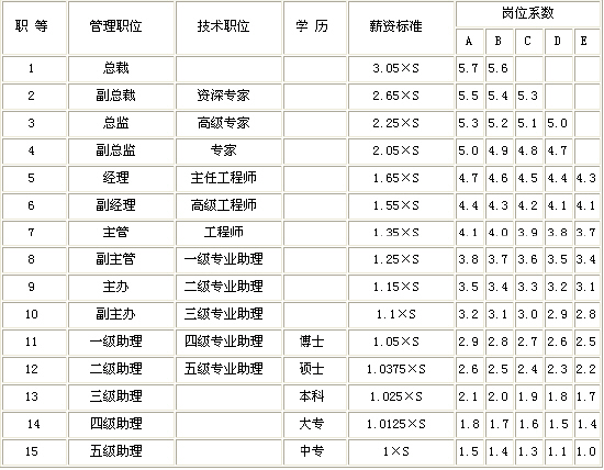 专业技术职务薪资与职位等级薪资的对接:(1)每一个专业技术职务都有一个相应的职位等级相对应(如下表)。(2)专业技术人员从一个技术职位晋升到另一个技术职位,所在薪资等级也相应晋升。(3)专业技术职务薪资与职位等级薪资也可以交叉调整,例如某一级专业技术人员可根据企业和自身的需要调任与之平行或晋升比之更高的管理职位。