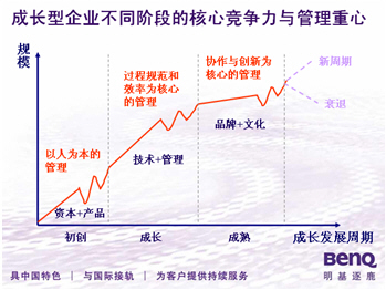 成长型企业发展周期可以被细分为初创、成长、成熟三个阶段。从管理的角度上看,第一阶段的管理模式可以称之为以人为本“一言堂”式的管理,主要是透过创业者驱动企业的发展,体现了最大程度的人性化和集权;第二阶段是规范化管理,重点在于建立规范化的管理体系和业务流程,这是企业大规模扩张,极速健康成长的一个重要基础;第三阶段,由于企业业务的稳定成长、业务流程相对规范、人员规模较大,管理以协作与创新为核心,强调员工对企业品牌和文化的认同,管理的弹性与规范、合作与开放。