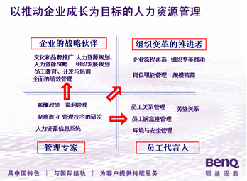 推动继续成长和精细化管理需求:随着企业的快速成长,产品市场占有进入稳定并完成上市等一系列在资本市场的动作,发展进入一个相对的成熟期,新业务的发展速度放缓,企业的业务和管理模式趋于一种暂时的动态的稳定。这个阶段企业内部表现出的是创业的激情逐渐冷却,取而代之的是企业的活性下降,部门间山头林立,反应变得“迟钝”。“人”成为企业继续成长最大的障碍同时也是企业内部最具潜力的资源。这个阶段人力资源管理成为促进企业继续成长、推动变革的核心手段,人力资源部门成为企业的战略策划和执行推动部门,成为企业继续成长的“发动机”。人力资源部门的角色完成从辅助部门到策略执行者到策略伙伴的蜕变,完成从“被动执行”到“主动参与”的转变(见上图)。人力资源管理实践的重点将是品牌守护和以支持企业继续成长和精细化管理需求为目标的人力资源管理的深度“e化”及文化和价值观的推广。