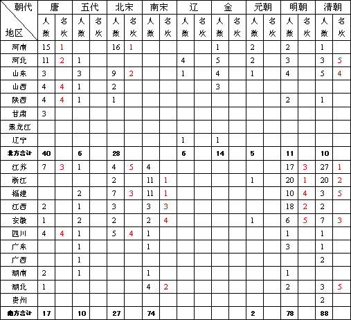 中国科举考试自隋朝开皇年间创立至清光绪三十一年废止历经1300多年,在南宋之前,进士(其中第一名状元)分布呈现一种特殊现象(见表1):第一,唐代状元主要分布在黄河中下游地区(基本上是淮河以北的学子,河南河北最多),包括所有进士在内,有时同一科甚至北南比例达9:1之高。第二,自北宋仁宗以后直至南宋这个比例发生了根本性的变化,中国状元的地理分布由黄河中下游地区转移到长江中下游地区,南宋时期科举考试进士比例南北方比高于5:5,其中状元比(见表2),自元朝后有时同一科进士南北方比甚至达9:1,如明朝的南北方状元人数比为78:11,清朝南北方状元人数比为88:10,进士人数前五名的省份基本上是南方的省份,总数也是南方占绝对优势,若以进士人数前10名的城市更是集中在南方(见表3),(笔者将之称为中国人才历史第一次转折,虽然以当代的定义历史上有些人才并非进士出生,但总体而言进士出生的人才在整个中国自隋朝举行科举考试以来的绝大部分,同时在隋朝之前由于人才选拔制主要是世袭和举荐,北方人才居多)。