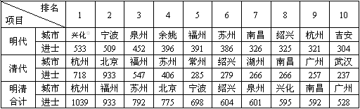 明清进士人数前十位的城市(表3)