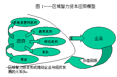 区域智力资本是指通过一种开放性的网络在地区内共享信息,通过最大化集体经验建立一个“智能社区”,从而充分利用不同机构与企业人员的潜能。智能社区将人员管理和信息管理联系起来,使人员创造力和信息结构之间达到平衡。这是一个首过良好培训的知识工人的网络,这些工人会在网络中通过系统的合作使组合知识的价值最大化,并最终转化为现实生产力,促进地区经济发展。