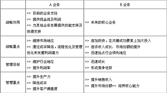 某集团公司主营业务为机械及电子类产品,其下属的两个业务单位:A为支柱业务,目前集团主要利润来源于A,市场占有率居国内首位,但优势不明显;B虽起步较晚,但市场潜力大,公司将加大投入力度,培育B业务成为未来的支柱业务。