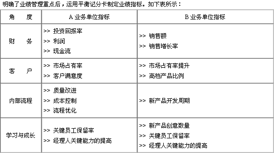 首先确定集团对业务单位业绩管理重点。A、B业务在集团的战略地位、管理重点的差别如下表所示。A业务处于成熟期,关注重点是行业地位、利润率的提升;B业务处于成长期,市场开拓力度、竞争优势是目前的重点。