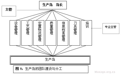 ZF公司在进行生产管理的过程中,始终以“提高产品质量”为指导思想,把两个新试点生产小组作为生产与管理的单位,以“工作扩大化”与“自主管理”为原理指导工作,制订了由人事部首先倡导推进的“2000年生产岛计划”。所谓生产岛,是由原有的生产小组的改造而来的、岛长领导下辅以专业分工的团队式自主管理体系。生产岛的自主管理体现在七个方面,即质量管理、设备管理、工艺管理、培训管理、定置物流管理、信息档案管理及刀具管理(见图7):