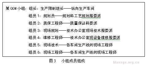 三、 生产管理层次的活动:这一层次以各生产线QQM小组为基本构成,这是Team工作法在生产线上实施的有效形式。QQM小组的成员来自多个不同的部门。下面举一个例子(见图3):