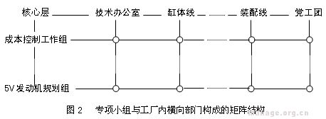 二、核心层建设团队的活动是以建设“专项小组”来开展的。“专项小组”包括成本控制工作组、人力资源组、安全文明组、规章制度组、TPM小组、质量控制组,5V发动机规划组等七个专项小组,它们与工厂管理层横向部门的支持小组构成了矩阵结构(见图2)。这些专项小组各有特色,工作亦有所不同,但在组成上,组员均是各纵向部门推荐、自愿从事兼职工作的优秀员工。组长由本专项有一定经验和兴趣的厂、科级领导兼任,规模大小为7-8人,以求高效。