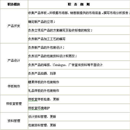 1. 设置糖果首席设计师一名,礼品首席设计师一名,分别负责糖果和礼品的概念开发。设计师3名,助理设计师2名。具体的工作分工如下: