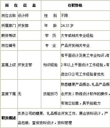 虽然礼品设计与工艺糖果设计有共通之处,但是毕竟在整体的概念和体现形式上还是有所不同。从A公司的任职资格描述中