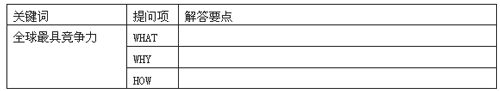 T公司的愿景是“成为全球最具有竞争力的××集团”。从这句话中,我们提取出“全球最具有竞争力”这一关键词。基于此关键词,我们可以用2W1H(What、Why、How)法设计面试题目: