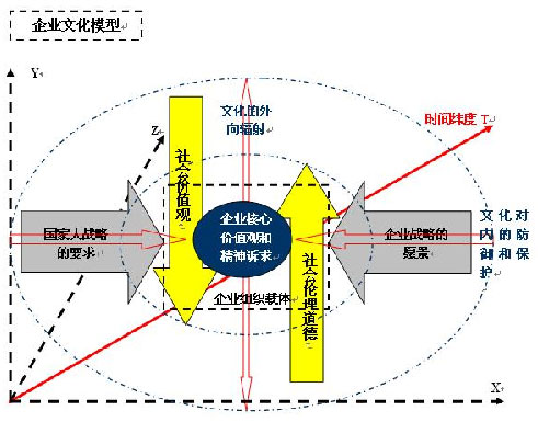 由此出发,我们来重新对企业文化作以定义:企业文化是一个系统,它是以企业组织为载体,在社会价值观和社会伦理这两条主线的双重贯穿下,相对动态地将国家大战略和企业战略愿景统一起来,并在一个四维的空间中朝向一个明确的方向而不断进化和发展的企业核心价值观和精神诉求;企业文化同时具备对外的扩张性和对内的防御性。
