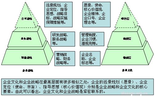 企业文化一般分为理念层、制度层、物质层三个层面,企业战略一般分为公司战略、业务战略、职能战略三个层面。企业文化和企业战略在最高层面有很多相似之处,企业的远景规划(愿景)、企业定位(使命、宗旨)、指导思想(核心价值观)分别是企业战略和企业文化的核心要素。