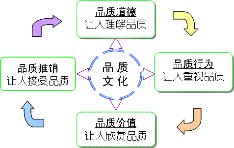 如图所述,品质文化是一种循环活动,周而复始。它的内容大致分为品质道德、品质行为、品质价值及品质推销四大类,也就是让人理解品质、让人重视品质、让人欣赏品质及让人接受品质。