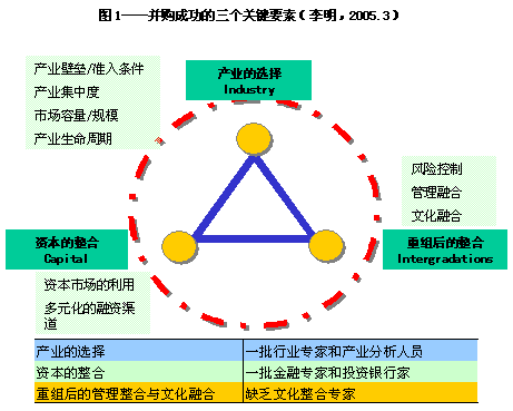 图1中概括了并购取得成功的三个关键因素,产业的选择(包括产业壁垒/准入条件、产业集中度、市场容量/规模、产业生命周期等子因素)、资本的整合(包括资本市场的利用、多元化的融资渠道等子因素)、重组后的整合(包括风险控制、管理融合、文化融合等子因素)。在众多的兼并与收购案例中,产业的选择和资本的整合由于有一大批行业专家和产业分析人员以及一大批金融专家和投资银行家的参与,使得并购活动本身进行得果敢而迅速,并购方总裁往往一夜之间就成了英雄和智者。