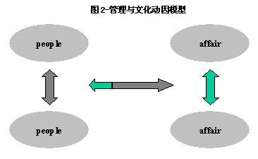 从管理实践的角度来说,管理的范围包括事(affair)与人(people)两个因子。事(affair)的因子主要是指企业的发展战略、业务流程、组织结构等,而人(people)的因子即人(people)和人(people)之间的关系,它的范畴则主要是企业文化层面上的东西,但企业文化并不完全就是人(people)和人(people)之间的关系,它还包括了人对事的态度、做事的方式等。把管理和文化有机地结合起来要处理的就是人(people)与(affair)之间的关系,如管理和文化动因模型图中所示。