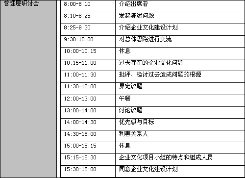 “火车跑得快,全凭车头带”,企业文化建设计划必须反映管理层的意愿和得到一致的理解。以下是管理层研讨会的一般议程: