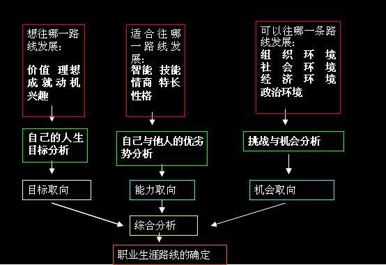 如何选择职业路线呢?如上图所示,职业路线的确定要从三个方面进行选择,一个是从个人的价值观、理想、成就动机、兴趣构成的个人的职业目标分析,一个是从个人所具有的智能、技能、特长能力等因素组成的个人与他人的优劣势比较分析,同时要从现实可行性的角度衡量,通过评估外部环境,从所处的组织环境、社会状况等方面来确定职业生涯的路线,最终综合目标取向、能力取向、机会取向三个方面的因素确定具体的职业生涯路线。