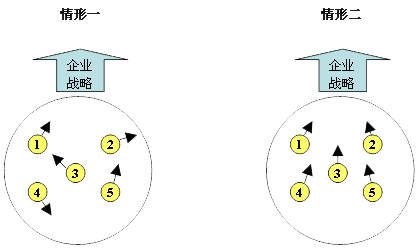 在和T企业合作的第二期,项目团队负责帮助T企业对人力资源管理体系进行优化,绩效管理是核心模块。在诊断过程中,项目团队发现,T企业过往在设计绩效管理体系时没有遵循一个系统思路,针对各类人员的绩效考核方法是自成体系且不相关的,无法为企业战略的实现提供保障,绩效管理的导向作用得不到有效挥发,正如图3中情形一所示。这种情况在国内企业中相当常见。