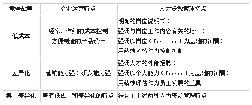 企业战略是企业前进的方向,同时也指明了前进的路径。企业战略的实现离不开相适应的企业管理,而人力资源管理是企业管理的一个重要组成部分。不同的企业战略对人力资源管理提出了不同的要求。Michael Porter教授提出了三大竞争战略,我们从表3中可以看出,每一种竞争战略都对应着不同的人力资源管理特点。