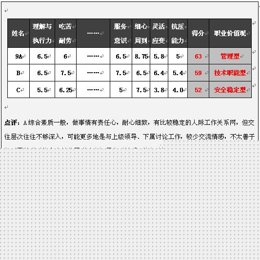 他们的结果由测评专家根据不同岗位的需要和对人员的要求进行整合,综合分析竞聘人员的胜任力素质水平、价值取向、人际关系、抗压能力、个性优缺点、发展潜力等内容,对竞聘同一岗位的人员进行工作胜任力排序,并对排列原因做出分析;对不合适目标岗位的竞聘人员推荐工作岗位;对具有发展潜力的人员提供干部后备培养和发展建议。