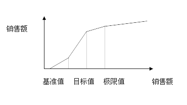 4、“分段式计提”,其主要特点是不但设置目标值,还要设置基准值和极限值,不同值之间设置一定的比例关系,同时不同值之间也设置不同的提成比例,从而对不同的销售业绩进行不同的激励。此方案既能给销售人员一定的销售压力,同时也能控制目标值设置的不合理,另外也能排除市场波动和运气所带来的影响,使销售提成收入真正反映销售人员的贡献度。但是此提成方案计算有些复杂,并且基准值、目标值和极限值的设置需要加以测算。(如下图所示)