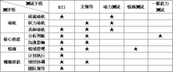 选择何种测评手段?不同的考察项需要有针对性的运用不同的测评手段和方法。近100位候选人的选拔,我们采取了BEI(行为事件访谈法,Behavioral Event Interview)、LGD(无领导小组讨论法,Leaderless Group Discussion)以及笔试的动力、智力和情商测验。详见下表: