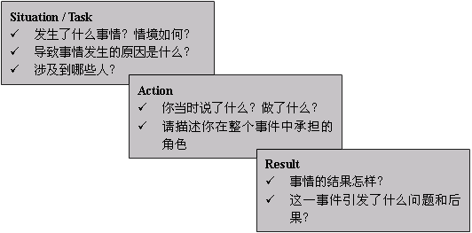 因为涉及到语言局限性的识别和提问技巧的掌握,BEI需要访谈者受过很专业的训练。核心步骤是让被访者讲述两到三个成功或失败事件,然后围绕着所需考察的能力素质不断提问,追问的STAR原则如下: