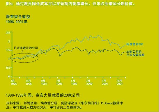 经济不景气时,企业更倾向于看重短期效益,降低成本压力是必不可少的举措之一:一方面减少对员工的投资,另一方面就是裁员。但企业在采取任何一种策略时,都必须谨慎行事。埃森哲对1996年到2001年大量裁员的美国公司的研究表明,全面裁员看起来是减少运营成本的简便方式,而且在短期内能够刺激增长,但长期来看却会损害公司复苏的能力,另外,裁员也会对公司的品牌形象造成负面影响(参见图三)。公司应对重要职位进行考虑分析、评估其员工的绩效并制定战略决策,力保正在增长的业务领域内最出色的员工。