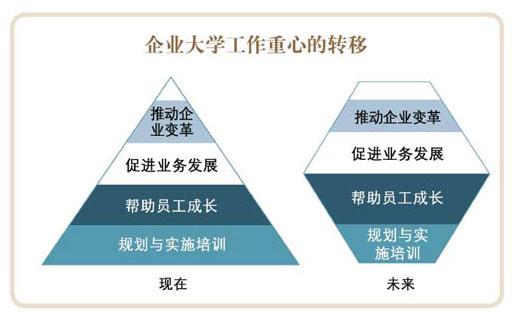 由此可见,企业大学不应该仅仅是一个从企业内部培训机构转化而来的单纯的人才培养机构。一个培训事务处理的专家,更应该是在战略层次下建立起来的传递企业文化和价值观、提高企业员工绩效水平、员工的企业责任感以及企业核心竞争力的全新组织形态,它实际承担着企业文化传播、企业自身发展和变革的职能。