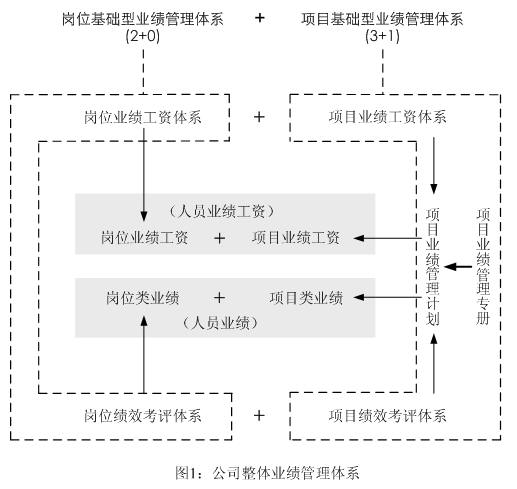 具有项目式业务特点的企业,必然有两类工作,一类是项目性工作,一类是常规的岗位性工作(如大部分职能管理工作),大多数部门和人员都多少不等的同时承担有这两类工作,因此,在对部门和人员的业绩管理上,必须同时使用岗位基础型业绩管理模式和项目基础型业绩管理模式,公司完整的业绩管理体系是这两类业绩管理模式的混合物,参见图1。