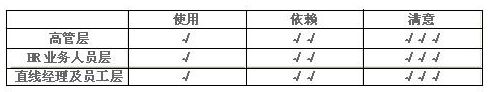 从HR业务人员层来看,首先所有已经上线的业务模块都要在系统里去用,而且不能是平时不用,只到每个周末才把一周发生的数据录进去,那就会降低动态管理的时效性。在每天使用的过程中就会对e-HR产生依赖,甚至是如果不用e-HR做就开展不了工作,比如上面不给工资总额和编制,下面就进不了人,发不了工资,没有绩效考核数据或新员工信息不入库,也没法发工资。最后,如果在整个使用过程中,HR都感到很舒服、易用、有效,那他自然就会感到满意。