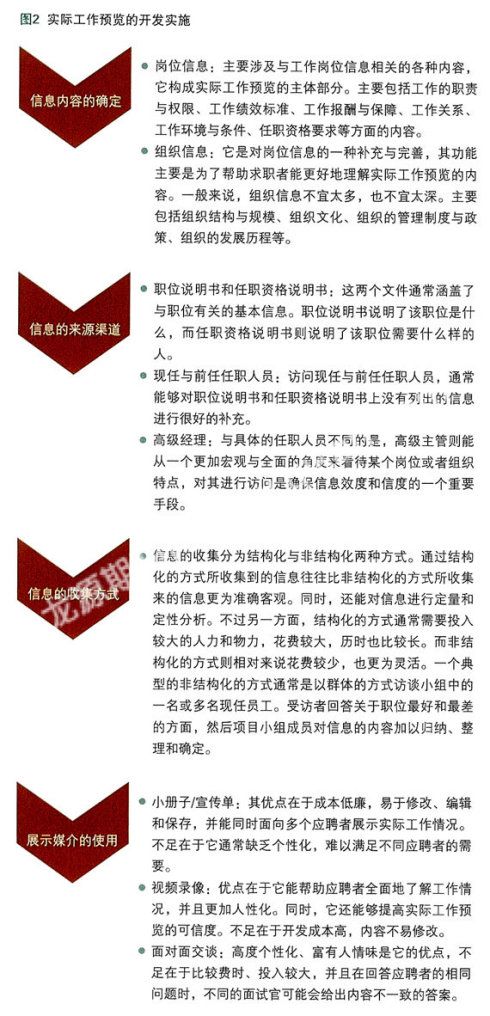 三是全面性。即实际工作预览所提供的信息不仅要包括职位信息,还要包括与职位相关的信息,如上下级关系、同事合作、工作环境等。同时还应包括对与组织有关的一些信息的介绍,如公司薪资政策、晋升渠道与方式、休假制度等等。