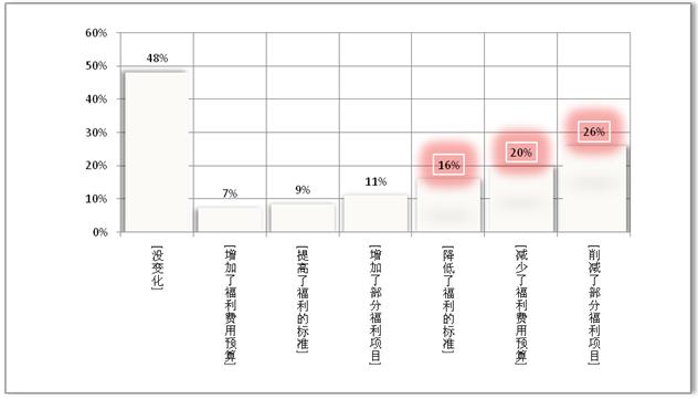 谈及福利变化,受访企业中有48%表示没有修改现有福利项目的计划,针对福利变化的前三中措施依次是:削减部分福利项目、减少福利费用预算、降低福利标准,分别占受访企业比例的26%、20%、16%。