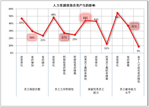 据和致咨询关于《特殊经济环境下中国人力资源管理报告》中数据显示,危机之下企业人力资源政策的改变,对于员工抱怨、工作积极性、优秀员工挽留、员工整体能力水平都会产生影响。