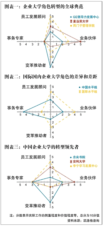 尽管如此,凯洛格在调查中也发现了一些积极的趋势,有越来越多的中国企业大学开始计划实施转型,他们中的少数甚至已经完成了转型。尽管尚未达到“全球典范”的程度,但这些先行者却也不失为中国企业大学的转型标杆。他们虽然也会将大量的时间和精力倾注在培训事务的处理上,但在其他角色上却已经渐渐“入戏”(见图表三)。