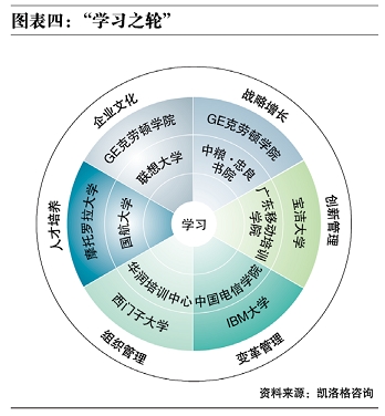 在业务力上,研究表明,CEO最关注六个方面的问题:战略增长、创新管理、变革转型、组织发展、人才培养和企业文化。企业大学要做的,就是提供适当的解决方案来支持CEO解决以上几方面的问题。凯洛格公司设计了一个“学习之轮”,运用学习之轮,可以评测企业大学在以上六个问题上哪个方面做得好,而在哪些方面还有不足(见图表四)。