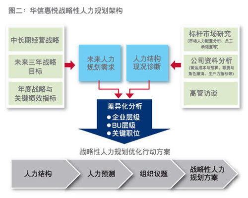 由于战略与运营需求瞬息万变,为了协助企业持续且动态地管理人力需求,华信惠悦提出了战略性人力规划的架构(见图二),简单来说,就是将组织未来发展方向转化为正确的人才战略及需求预估,并通过情境模拟分析与最佳成本效益预估,提出行动方案,以使人才的质量、数量与结构能满足营运需求。战略性人力规划可区分为四大步骤: