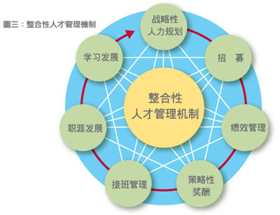 运用战略性人力规划的架构与方法,同时连结人才的选用育留机制(见图三);借助掌握未来人力需求与现况的差异分析,制订不同的人才招募战略;给予不同的绩效目标,使人才得以发挥所长;连结市场的奖酬机制,激励与留置人才;同时配合系统化的接班管理,深化人才“板凳”,使人才的职涯发展与学习能与组织未来发展结合。如此,企业所进行的人力规划将不再局限于人力盘点或人数预估;而是能结合经营战略、兼顾成本效益,满足未来人才质量需求的机制。