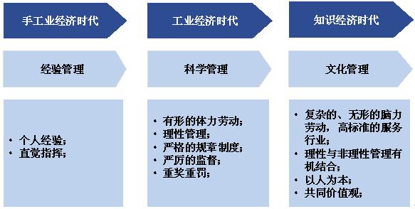 文化管理一定是一个“以人为本”的世界里企业管理发展的必然趋势,如下图所示,管理在不同经济阶段的表现形态:
