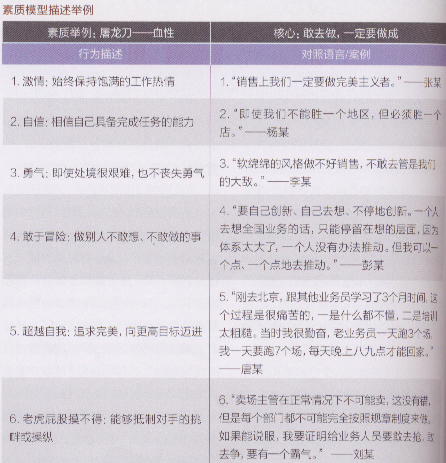 第三, 在每个行为描述后附上标杆人物的鲜活语言或简短案例,让销售人员感觉亲切并增加参与人员的荣誉感,进一步强化素质模型的理解和推广。
