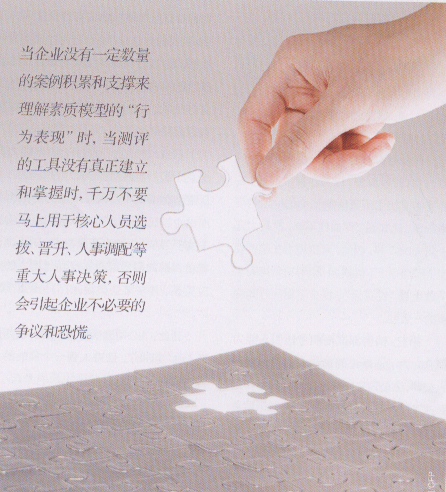 误区三:直接用素质模型进行人事决策。企业完成素质模型构建的时候,其实只是完成了三分之一的工作而已,它只是个“半成品”,后续的应用体系开发和实施才能更直接地体现模型的应用价值。当企业没有一定数量的案例积累和支撑来理解素质模型的“行为表现”时,当测评的工具没有真正建立和掌握时,也就是评估者未能真正理解被测者的行为与能力的对应关系时,千万不要马上用于核心人员选拔、晋升、人事调配等重大事决策,否则会引起企业不必要的争议和恐慌。