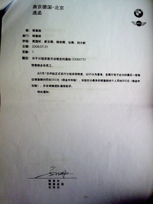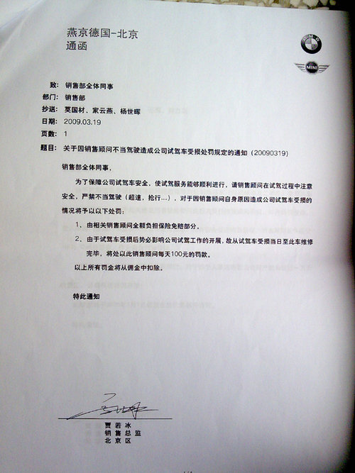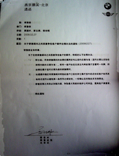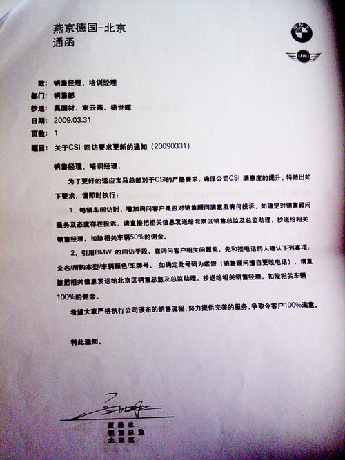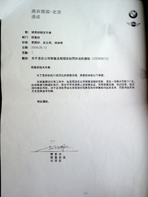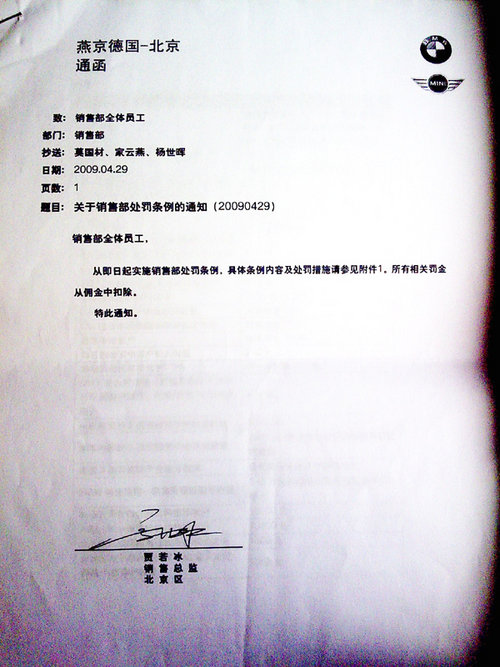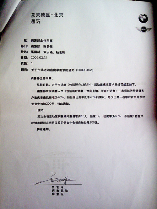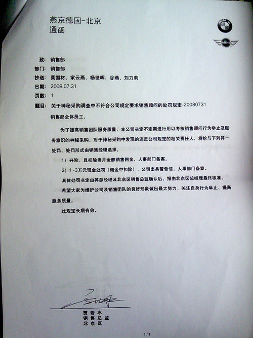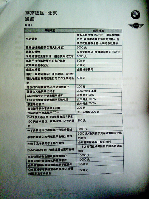 在记者收到的材料中,包括11张用数码相机拍摄的《燕宝德国-北京通函》和一张包含56个罚款项目的“销售接待登记表”。11张《燕宝德国-北 京通函》均为各种名目的处罚规定,罚金从200元到3万元不等。在“销售接待登记表”上,宝马销售人员被要求必须询问顾客“其它品牌,为什么对其它品牌感 兴趣”,“竞争车型和目标车型的优缺点”,并“列举有说服力的事实数据解释比较”,否则每项罚款50元。在报价环节中,销售人员被要求“一开始提到价格时 不主动提到折扣”,“顾客犹豫时有极力促进成交的表现”,并“提供客户需要的材料帮其作出决定”,否则每项罚款50元或100元。