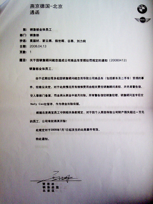 他表示,燕宝内部私自制订高额罚款的项目,对一线员工造成了巨大的经济损失和心理压力。“燕宝的销售顾问中没有人未被罚过款,而且罚款的项目多 种多样,大到宝马中国派遣‘神秘采购调查’随时检查销售人员,如不合格罚款1万~3万元,小到平时上班的仪容仪表,如不合格罚款50元~100元。各种名 目繁多的罚款,已经让很多员工对公司失去了信心。”