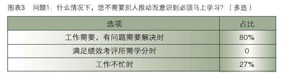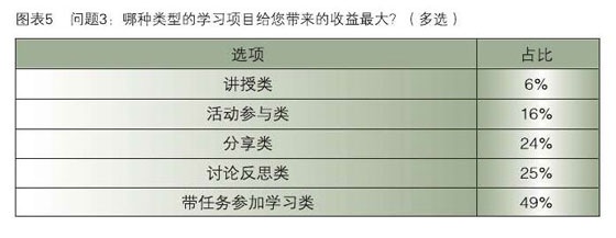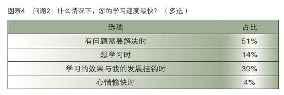 以上“1+3问题”的调查结果显示, 100名培训管理员对 “用以致学”的学习原则更认同,尤其是在图表3中,80%的被调查者认为学习的行动是为了应对工作中遇到的挑战。此外,“用以致学”原则在能够有效促进培训与企业战略及业务的结合,在行为和绩效层面上评估学习效果,以及有效激发学习动机的方面也获得了一致认同。