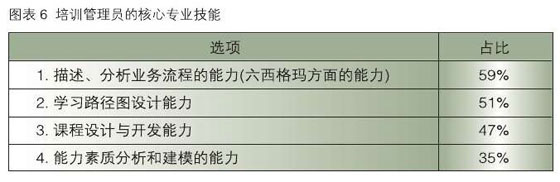 图表6中“描述和分析业务流程的能力”是培训管理员最大的软肋。这直接导致培训管理人员只能“软禁”在培训中心的象牙塔中,设计一些与公司核心业务挂钩的所谓通用类的培训,扮演成本费用单位二线甚至三线部门的角色。此外,培训管理员还需依照第2~4点提升自身的专业技能。
