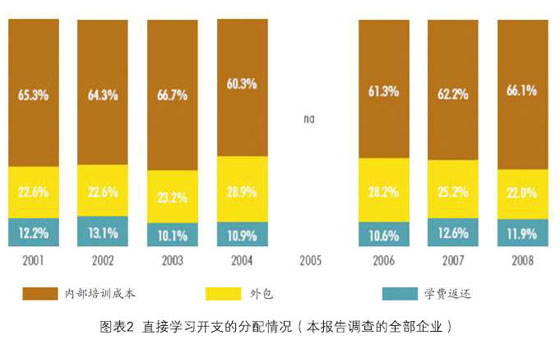 从最近几年的年度统计数据看,外包或用于外聘服务——诸如顾问、讲习班和由外部供应商提供的培训课程——的开支也没有太大变化。自2004年以来,企业对外包服务的依赖越来越小。分配给外部服务的学习预算的平均比例在2008年为22%,而2007年则达到25.2%(见图表2)。