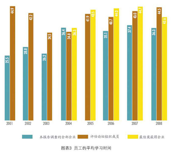 在接受调查的企业中,2008年员工用于正式学习活动的平均时间为36.3小时,与2007年相比虽然略有下降,但仍意味着企业为每名员工的在职学习和提高绩效投入了大量的资源。尽管面临着在普遍的财政压力情况下工作成果最大化的压力,员工依然期望每年能参加更多的学习活动。