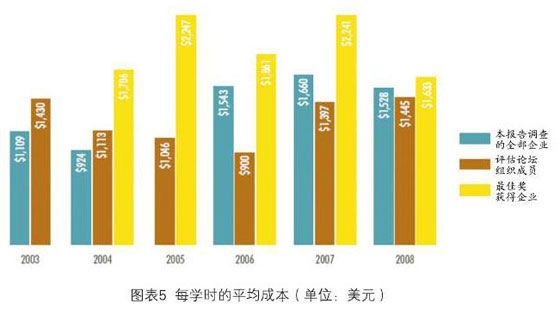 2008年,负责学习的专业人士也成功地找到了管理学习内容的方法,同时降低成本(见图表3、4、5)。平均来说,每位WLP职员能提供353小时的正式学习内容。这个数字与2007年相比有所增长,接近前几年的最高平均水平。生产效益的实现并不意味着不惜血本,事实恰恰相反,从历年接受调查企业的总情况看,每小时学习内容的平均成本从2007年的1660美元下降为2008年的1528美元,降幅为8%。