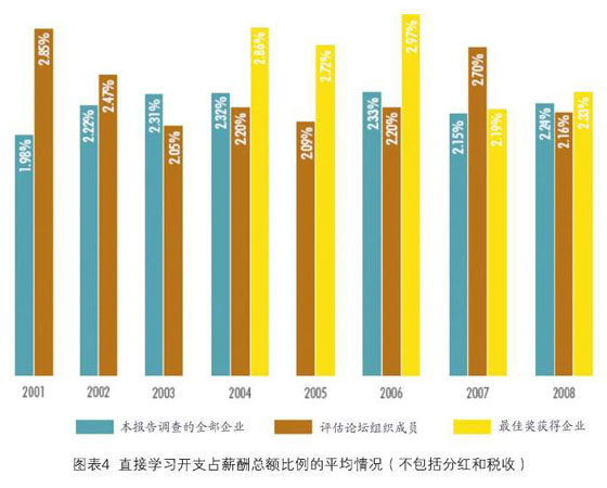 根据产业状况报告所调查的全部企业的统计数据,企业对学习的投入继续保持了前几年的趋势。从汇总的数据来看,平均学习开支占薪酬总额的比例实际上从2007年的2.15%上升到2008年的2.24%,虽然近年来企业的薪酬变得愈发富有弹性,在ASTD每年收集的数据中,此项指标却一直非常稳定。学习开支占企业收入的比例在近年来同样相当稳定。平均而言,2008年,直接学习开支占企业收入的比例为0.59%,与2007年的0.56%相比略有上升。
